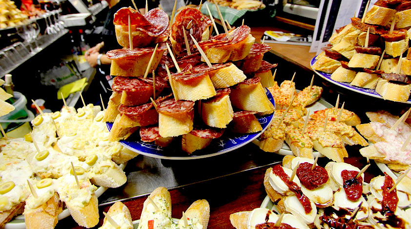 In a nutshell, pintxos are ‘Basque-fied’ tapas. They are examples of miniature cuisine derived from Spain’s traditional tapas but unlike tapas, pintxos are usually held together by a pincho which translates to “pointed stick” or simply toothpick, hence the name. They are also often ‘spiked’ to a piece of bread, whereas tapas can be cold olives, chorizo, Spanish ham (jamon) or anything served in small plates. Pintxos are also ordered and paid for independently from the drinks. Tapas, however, traditionally used to come with the drink you ordered. Order a drink and a free tapa automatically comes with it, much like an appetizer. That changed and now you must order and pay for your tapas which are often listed on the menu under the tapas column. Most traditional cities in Spain keep the tradition alive and retained the practice of not charging for tapas though. If you want to score a free tapa with the price of your drink, head to Granada, Alcalá de Henares or Madrid where you’ll most likely chance upon the most traditional of tapas bars.