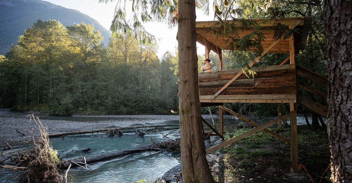Guests depart from Klahoose Wilderness Resort, embarking on a scenic one-hour journey by covered boat, passing by stunning Toba Inlet waterfalls and watching for marine life along the way. Upon arrival at the dock, a short bus ride takes visitors to the bear viewing platforms, nestled in the lush temperate rainforest of the Toba Valley, along the glacier-blue waters of a remote wilderness river.