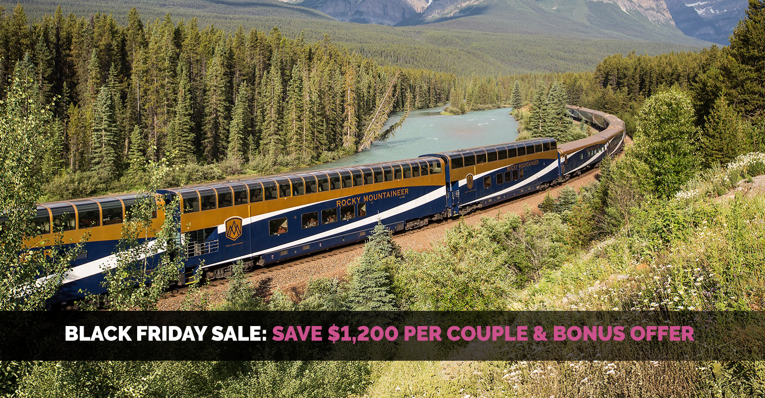 Rocky Mountaineer 2026 Black Friday Promotion: Applies only to new bookings on select travel dates in 2026 on Rocky Mountaineer routes. High demand dates are excluded. Bookings must be made between November 20 and December 5, 2025, to qualify. Available on GoldLeaf Service or SilverLeaf Service (varied discounts apply). Offer is per person and applies to single and double occupancy bookings, and will be automatically added to booking if the travel date is eligible. Offer has no cash value, is non-transferable and cannot be deferred to a later trip unless specified or retroactively applied. Offer is capacity controlled and may be modified, withdrawn or amended without prior notice.